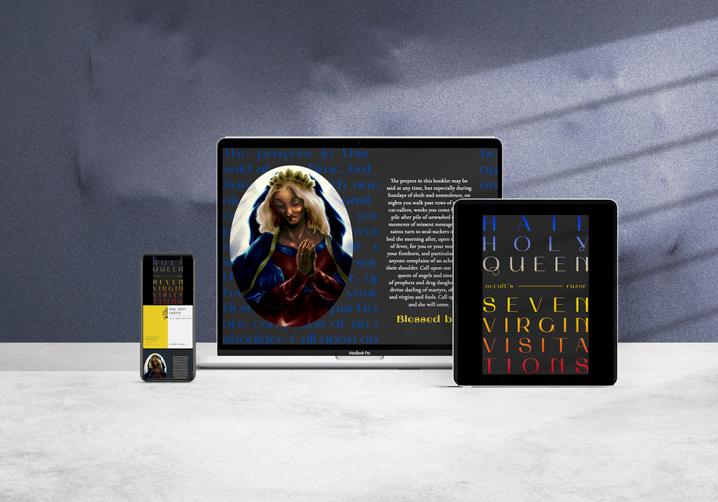 “Hail Holy Queen: Seven Virgin Visitations” is a zine of pleas and prayers, apparitions and visitations, of ladies who are one lady, queen, mother, and woman.